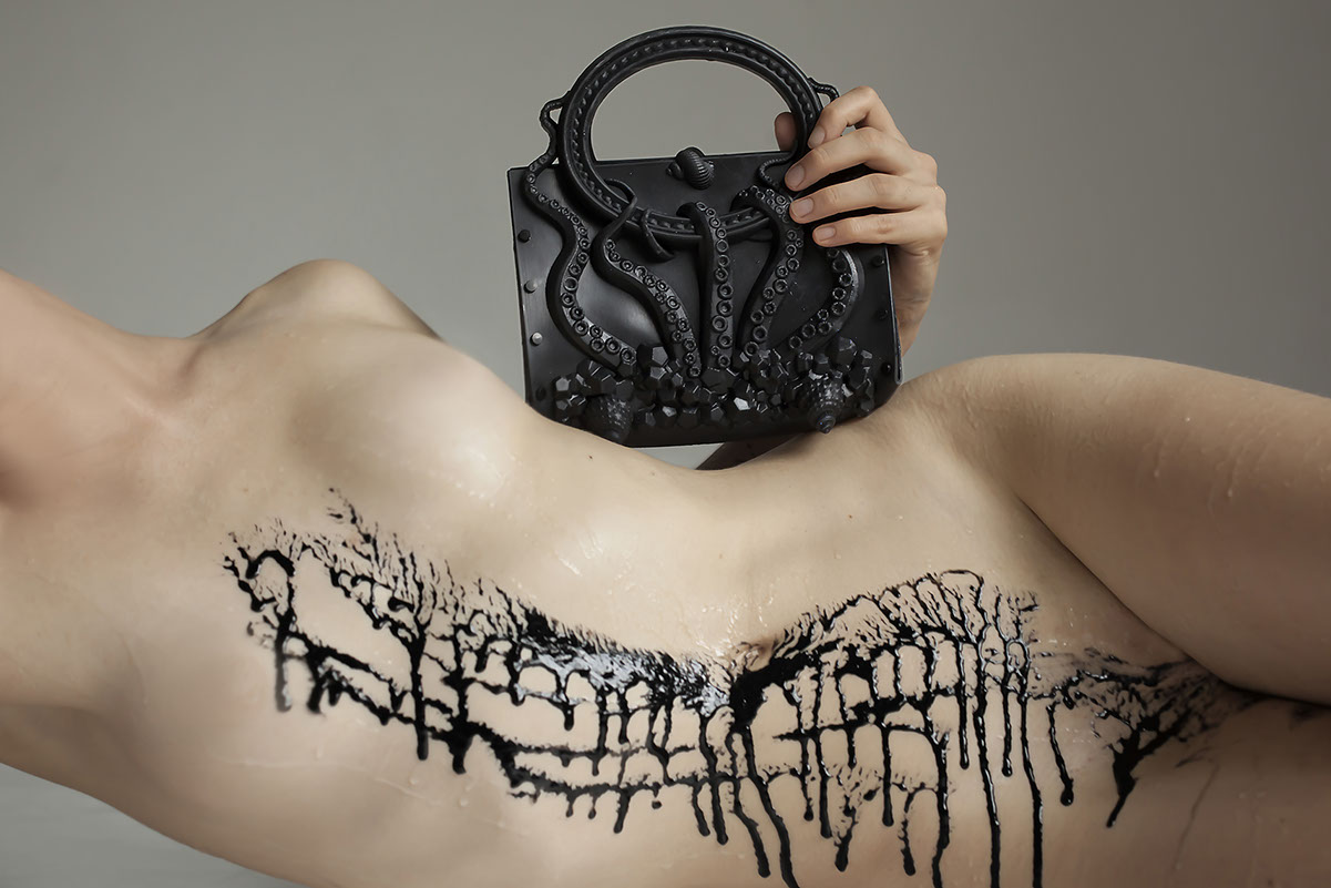 THE RUBBER COLLECTION, A HANDBAG TO CLUTCH AND TOUCH, CARESS, STROKE, PLAY, DISCOVER, BEFRIEND, SHOW OFF, RESPECT, HOLD TIGHT, TALK TO, RUB, FEEL, SWIM WITH, PARTY WITH, ADMIRE, DREAM STORIES WITH AND USE AS A HANDBAG.